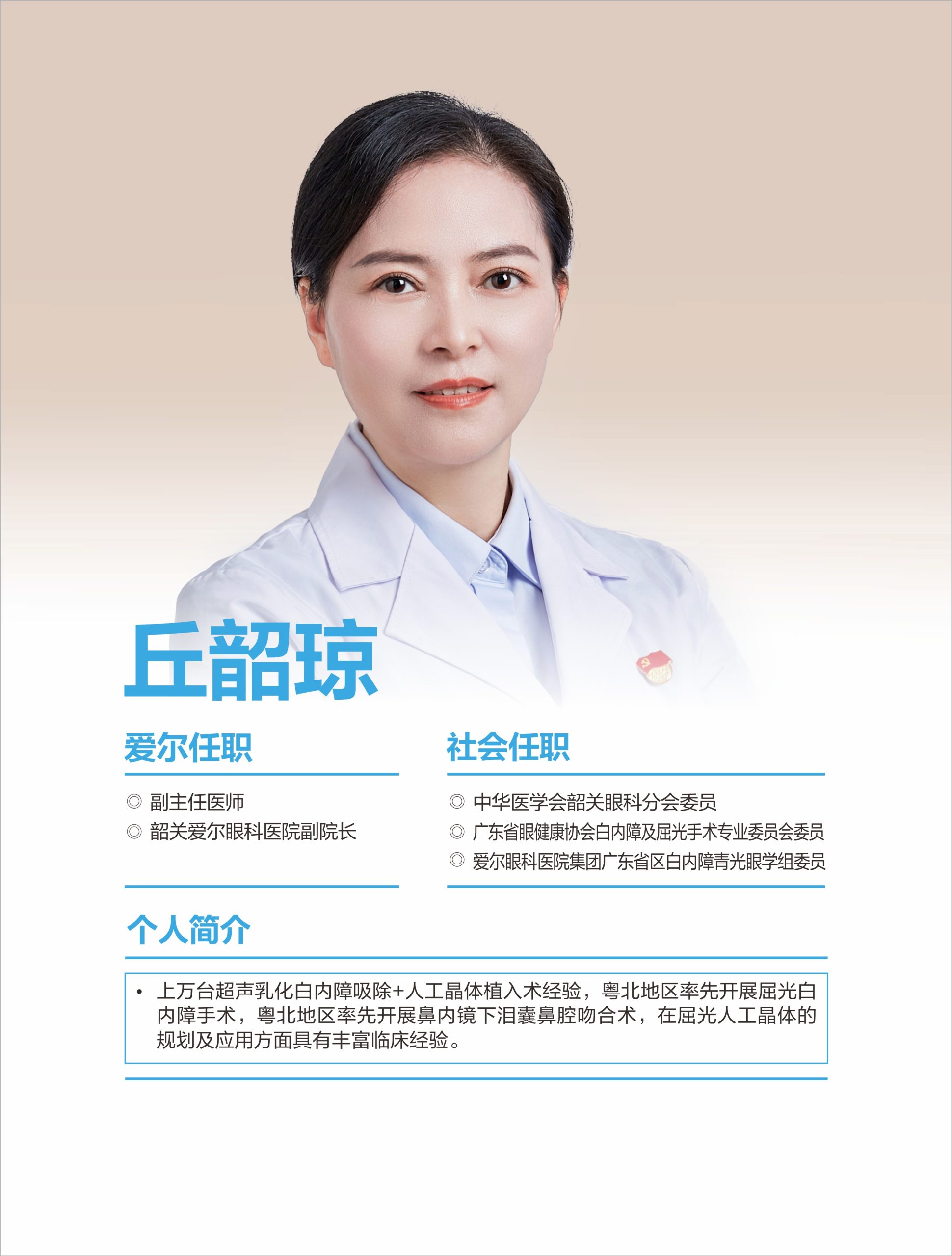 韶關(guān)愛爾眼科醫(yī)院有限公司白內(nèi)障團隊擁王愛琴院長(愛爾眼科粵北區(qū))、丘韶瓊院長、郭俊豪主任等多位??漆t(yī)生,具備同步國際的白內(nèi)障手術(shù)能力,能熟練開展各項常規(guī)及疑難白內(nèi)障手術(shù)。 可開展微切口煥晶白內(nèi)障手術(shù),植入多焦晶體或多焦+散光矯正晶體,在治療白內(nèi)障同時同步解決遠(yuǎn)視/近視、老花眼、角膜散光等屈光問題,醫(yī)生手術(shù)經(jīng)驗豐富,為眾多患者帶來更舒適的視覺。